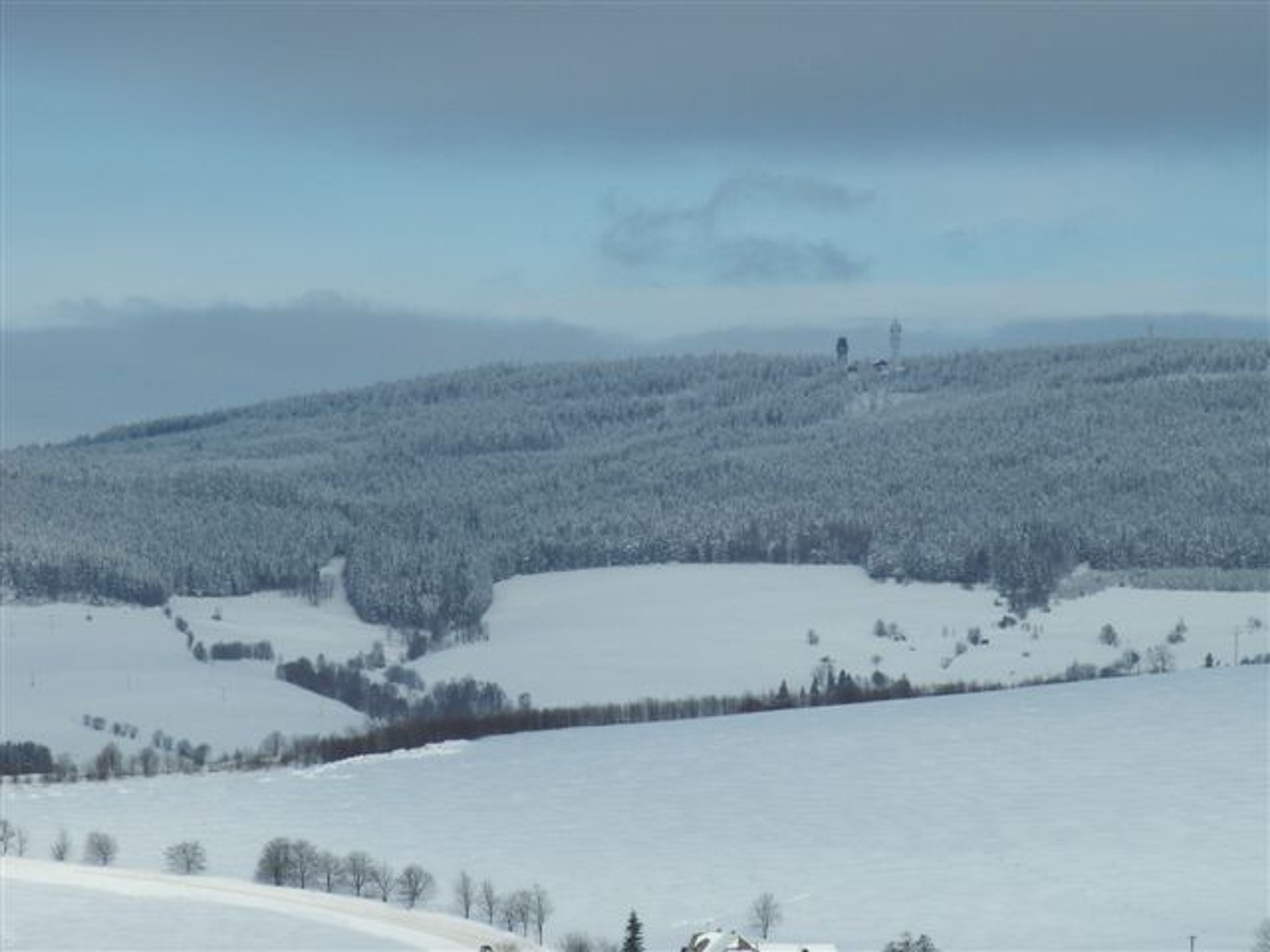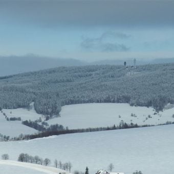 The double-peaked Suchý vrch reaches an elevation of 995 meters and marks the drainage divide between the North Sea and Black Sea basins.