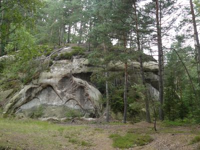 Sandstone rock formations shape the landscape of Apolena, featuring steep cliffs, dense forest coverage, and exposed geological structures formed through natural processes.