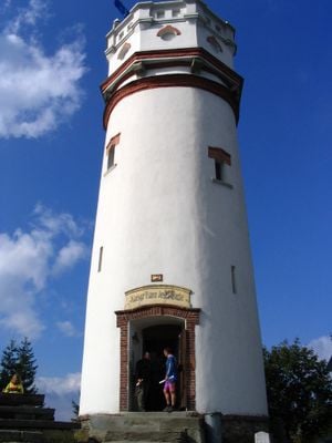 Wieża widokowa na Biskupiej Kopie is an observation tower in Zlaté Hory, Czech Republic, featuring an octagonal stone structure with rounded corners. The 18-meter tall building stands at 890 meters elevation on Biskupska Kupa mountain.