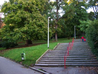 Park Santoška stretches across the slopes of Paví vrch, featuring multiple levels connected by stone staircases and interwoven with pathways throughout the grounds.