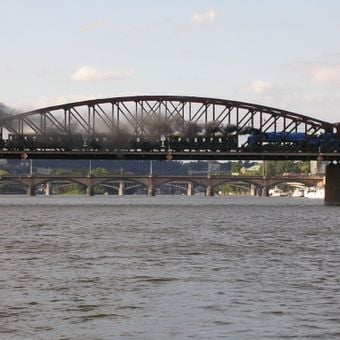 The Vyšehrad Railway Bridge is a structure spanning the Vltava River that connects the districts of Vyšehrad and Smíchov. It features steel beams and five arches, carrying both train traffic and pedestrians.