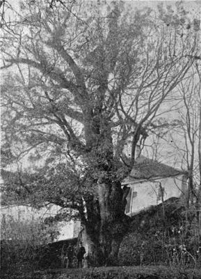 The summer oak measures 20 meters in height with a trunk circumference of 1010 centimeters, featuring a central hollow covered with a shingle roof.