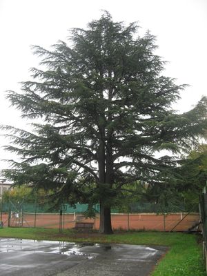 The cedar tree rises 14 meters high with a trunk circumference of 265 centimeters, displaying its characteristic silvery-green needles in the tennis club area.