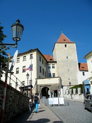 The Black Tower is a fortified structure within Prague Castle featuring thick stone walls and Romanesque architectural details. The structure originally served as the eastern gate to the castle complex and now houses an archaeological collection from the fortress.