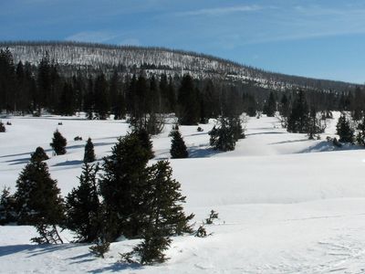 Multiple marked hiking trails lead to the summit from nearby parking areas, with winter access requiring specialized equipment due to heavy snow coverage.
