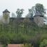 The stone walls of Hrad Brumov stand on a hill, displaying medieval defense architecture with remaining towers and fortification elements.