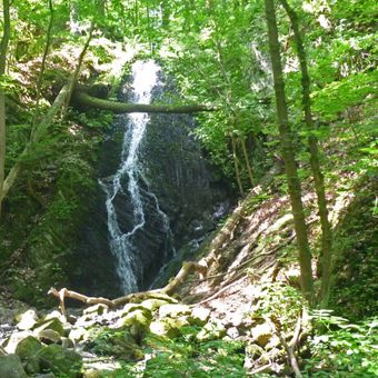 The waterfall emerged through natural erosion processes within the České středohoří mountain range, carving through volcanic basalt formations over thousands of years.