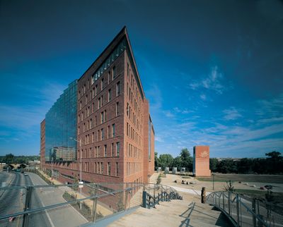The architectural design incorporates red sandstone facades and structural elements that reference Prague's medieval and gothic architectural traditions.