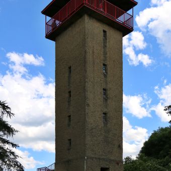The rectangular stone tower rises 15 meters above the hill Milenka, featuring a glass observation platform and an open gallery at 580 meters elevation.