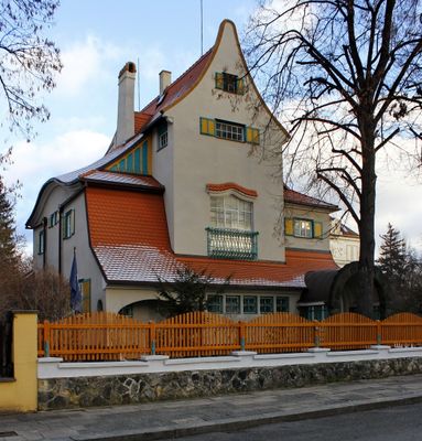 Villa of Jan Náhlovský is a residential building that stands in Prague's Bubeneč district and demonstrates early modernist principles combined with handcrafted details. The structure features carefully designed facades with timber framing and geometric patterns that define the exterior composition.