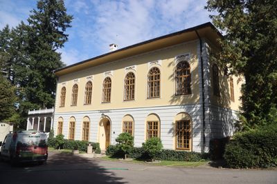 The castle exhibits classical architectural elements with symmetrical design, columns, and proportions characteristic of nineteenth-century European construction methods.