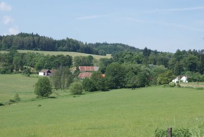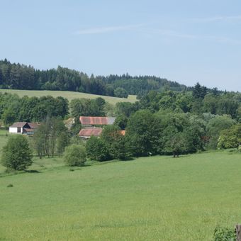 Socha svatého Jana Nepomuckého uprostřed křižovatky u zámku v Mačicích