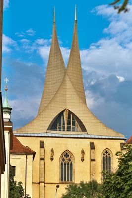 Kostel Panny Marie na Slovanech is a three-nave Gothic church standing within the Emmaus Monastery complex on Vyšehradská Street. The structure underwent significant reconstruction after World War II, resulting in its distinctive modern concrete front.