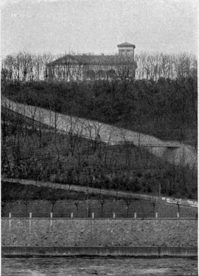 The Letenský zámeček stands as a two-story building with a quadrangular tower and large semi-circular windows facing the Vltava River.
