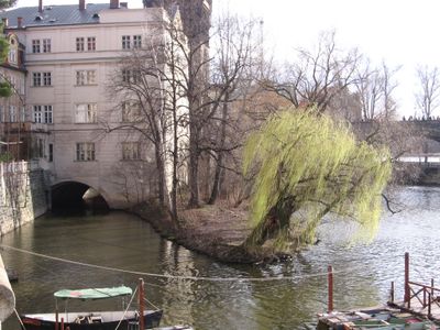 The small island starts beneath a pillar supporting the Old Town Bridge Tower and extends along the right bank of Vltava River.
