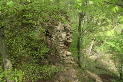 The remains of Lamberk Castle stand on a steep ridge along the left bank of the Oslava River, southwest of the village of Březník.