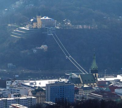 Lanová dráha Větruše is a cable car system in northern Bohemia that connects the city center of Ústí nad Labem to an elevated area. It travels upward over the urban landscape, carrying passengers between the downtown level and facilities located on the hilltop.