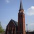 The red brick Church of Saint Paul exhibits Gothic Revival architecture with two towers and stone exterior walls designed by August Kirstein.
