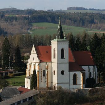 The Church of Saint Procopius rises at the center of Letovice with a Gothic architectural design and a covered staircase connecting to the town.