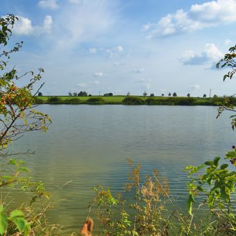 Nebeský rybník encompasses wetlands with diverse aquatic life, surrounded by forested areas and meadows in rolling hills of the Drahany region.