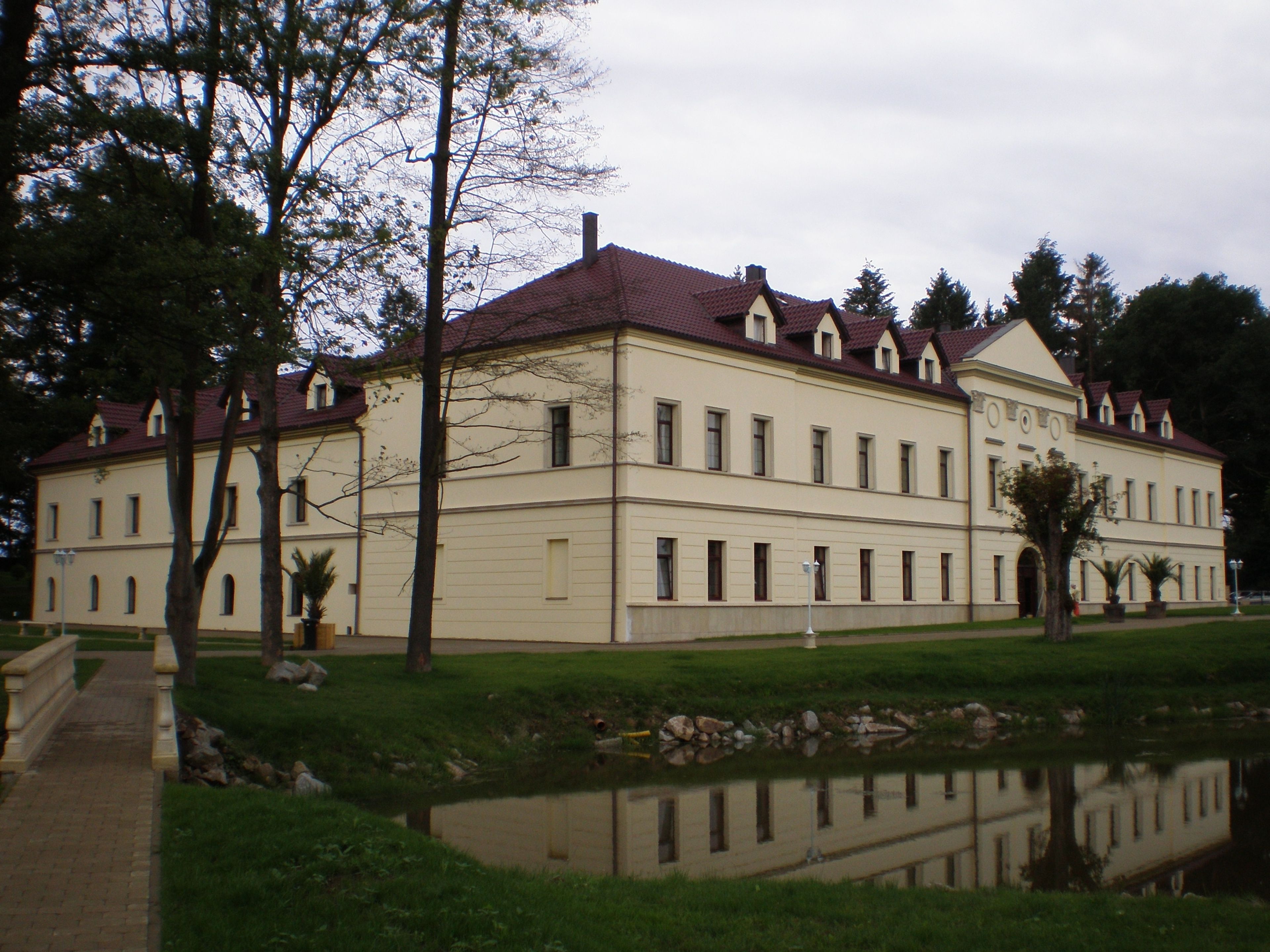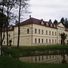 The castle complex features a stone courtyard, a funeral chapel, and an extensive park surrounded by traditional architectural elements of the region.