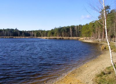 The pond area features pine forests and peat bogs, making it accessible through maintained paths suitable for walking, cycling, and stroller access.