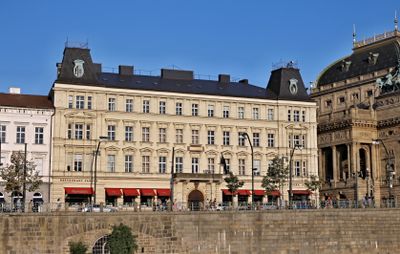 Located at Národní 1012/1 in Prague's Old Town, the palace contains the Coffeehouse Slavia on its ground floor, offering views of Vltava River.