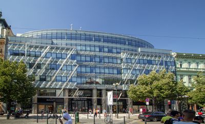 The glass-fronted Palác Myslbek connects Old Town and New Town Prague through a central arcade spanning between Na Příkopě and Ovocný trh streets.