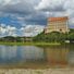The Plumlov château stands tall above a water reservoir, featuring an unfinished three-story structure with multiple wings in the Moravian landscape.