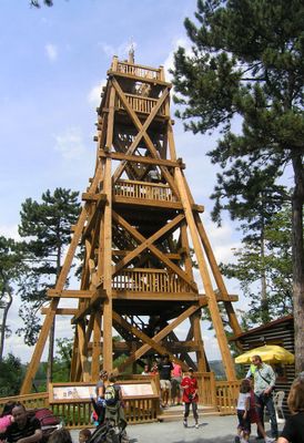 The wooden observation tower stands 18.5 meters tall within Prague Zoo, featuring four viewing platforms connected by double-flight staircases with intermediate landings.