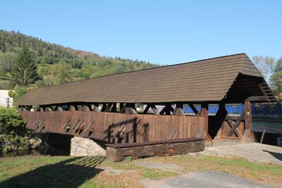 The wooden bridge stretches 32 meters across the Svratka River, featuring a covered design that protects pedestrians and the structure from weather conditions.