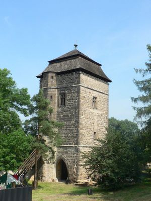 Tuchoraz is a Gothic castle ruin featuring preserved stone walls and an intact entrance tower from the 15th century. The remaining structural elements still show the layout and form of its medieval military design.