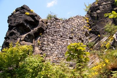 The stone remnants of Vrabinec Castle stand upon elevated terrain between the settlements of Babětín and Těchlovice in northern Bohemia.