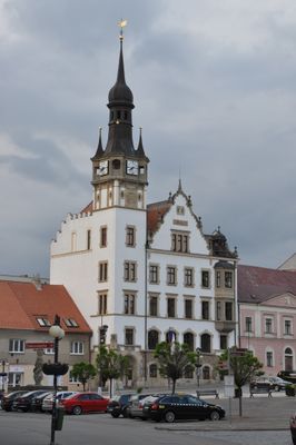 The Neo-renaissance town hall stands prominently in the town center, displaying sandstone details and a clock tower facing the main square.