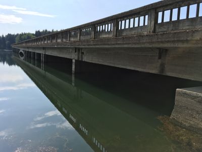 The concrete bridge spans across the Sedlický River with sections submerged beneath the reservoir waters of the Bohemian-Moravian Highlands.