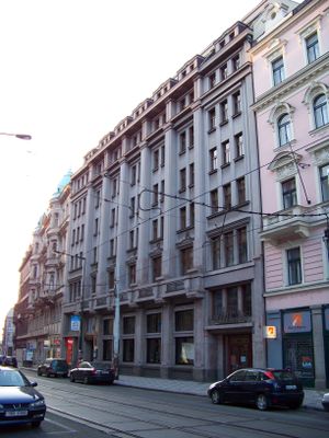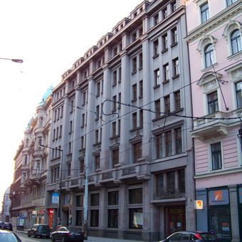 Architects Bohumír Kozák and Antonín Černý designed this structure in 1936 for Italian insurance companies, completing the construction in 1938.