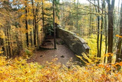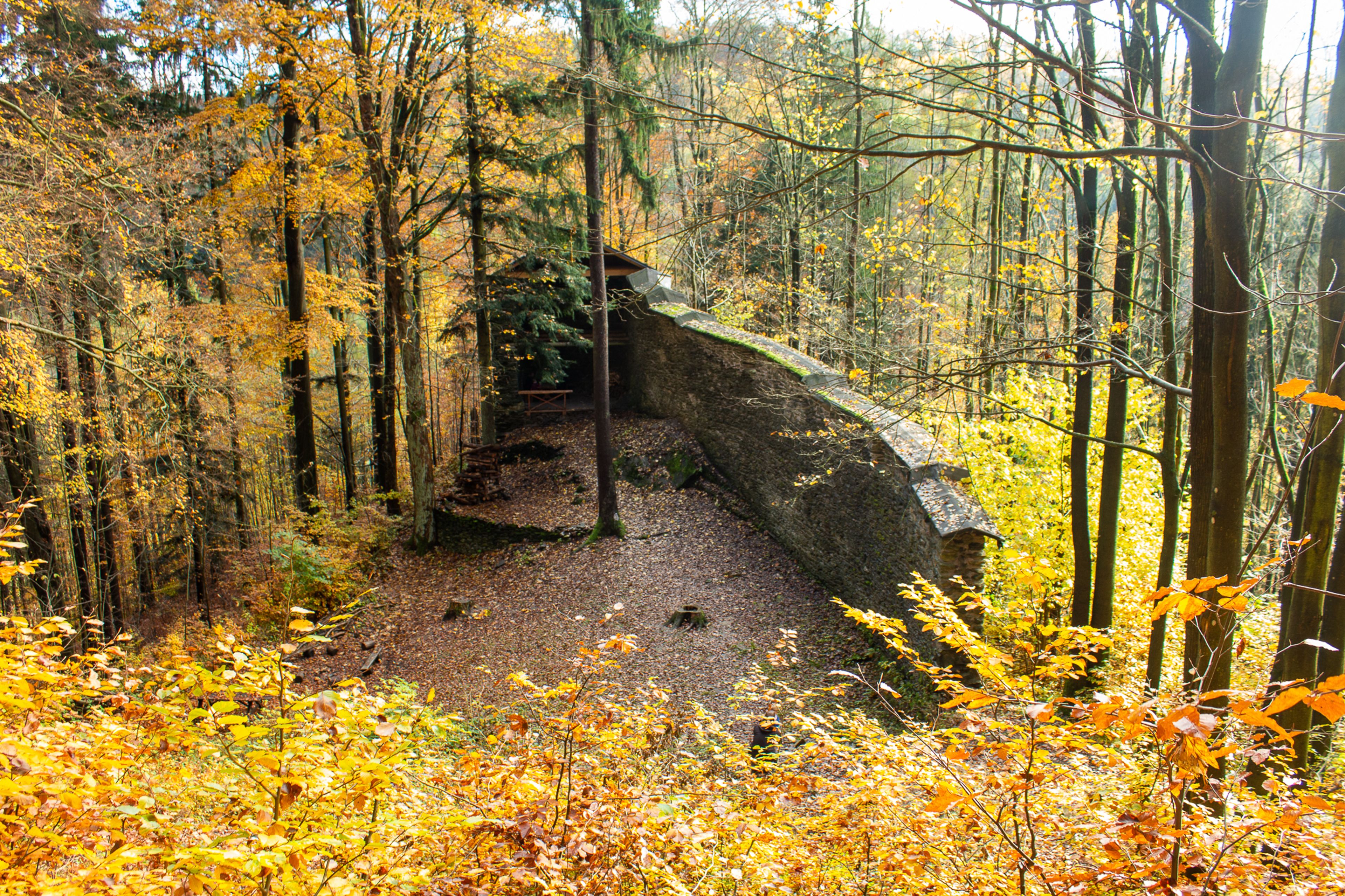 The remains of this Gothic castle include stone walls and foundations nestled among the hills of northern Bohemia at an elevation of 522 meters.