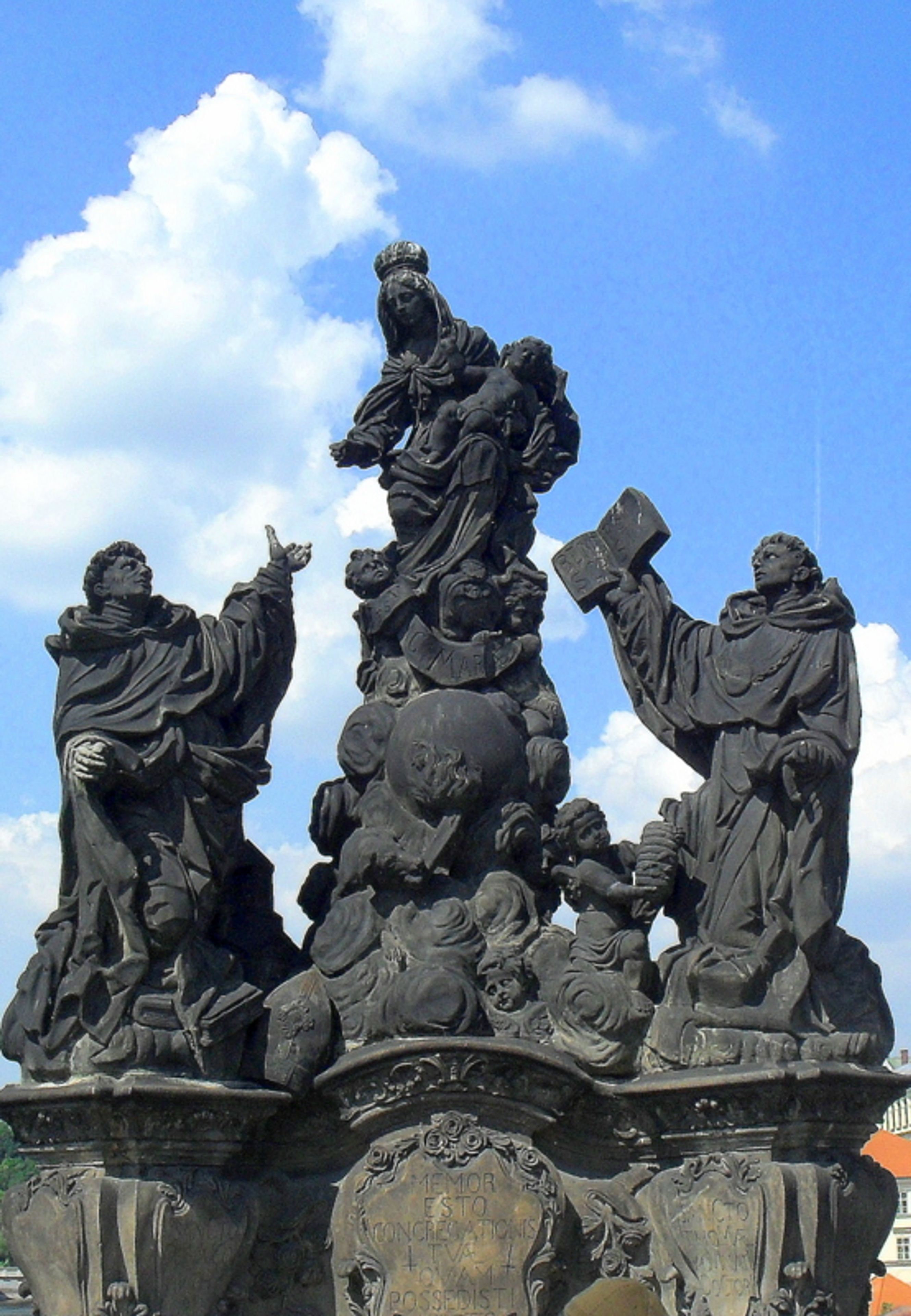 Madonna with Saint Dominic and Thomas Aquinas, Religious sculpture on Charles Bridge, Czech Republic