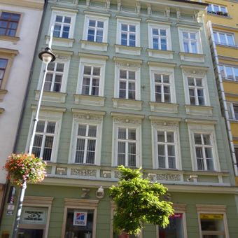 Sousoší Svatých Jáchyma a Anny s Pannou Marií na zdi kláštera Voršilek z Orlí ulice v Brně
