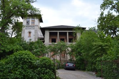 The villa's architectural design includes a prominent tower with a pyramidal roof, Tuscan columns, and sgraffito decorations created by painter Viktor Schubert.