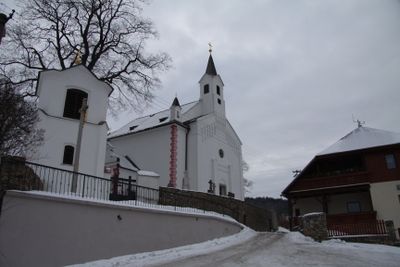 The Church of Holy Trinity stands as a religious monument featuring traditional Czech architectural elements within the rural landscape of South Bohemia.