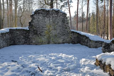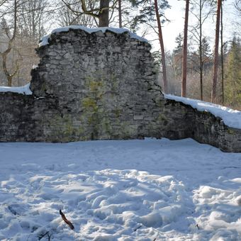 The stone walls of this medieval church structure remain standing within a forested area near thermal springs of Karlovy Vary, marking its original location.