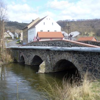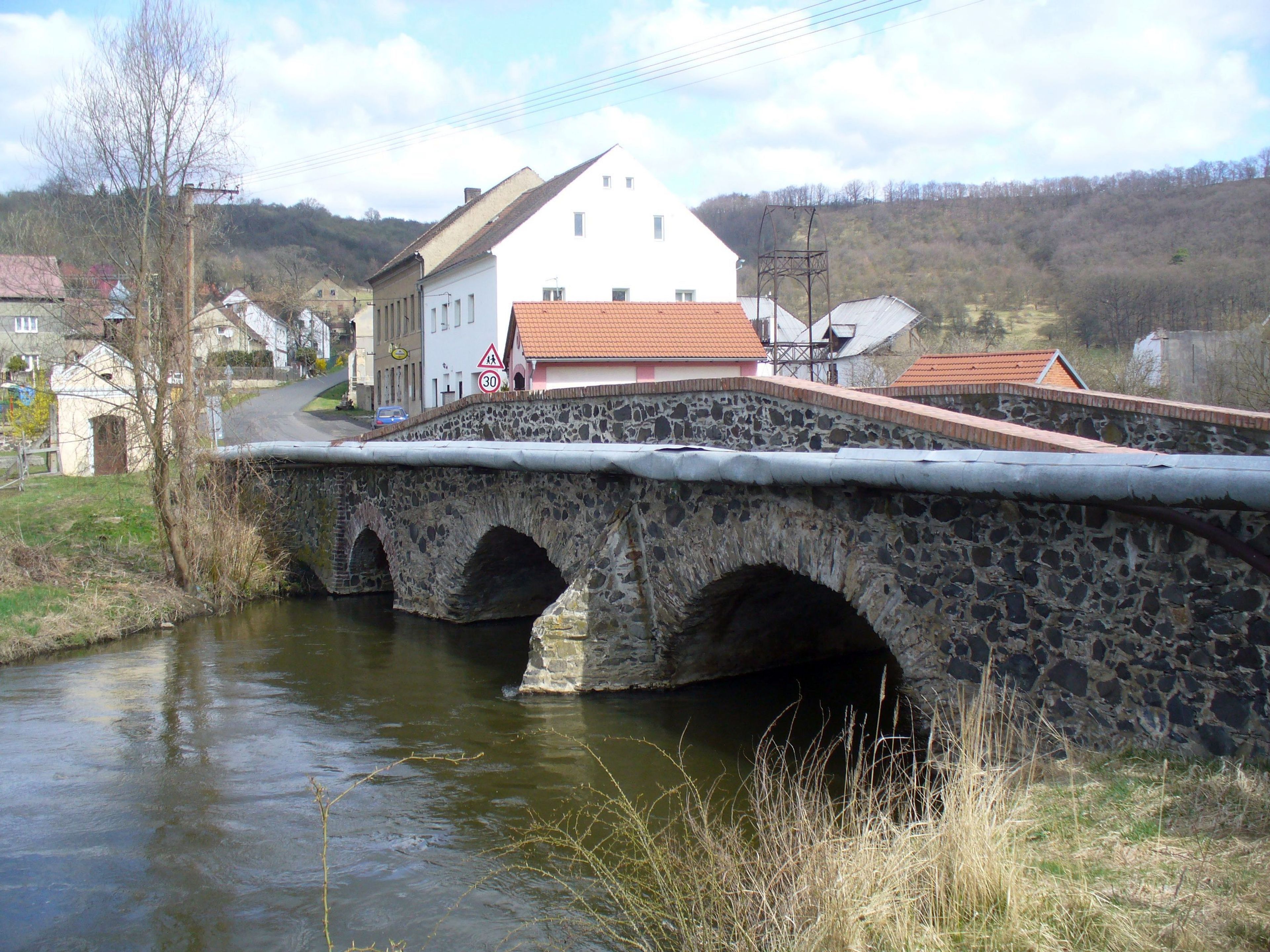 Stone bridge in Lbín, tříobloukový most silnice III/25328 přes Bílinu