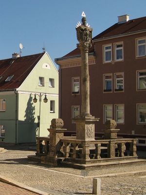 Located at coordinates 50.119448, 12.529414, the column stands in the center of town, accessible through marked walking paths from the main square.