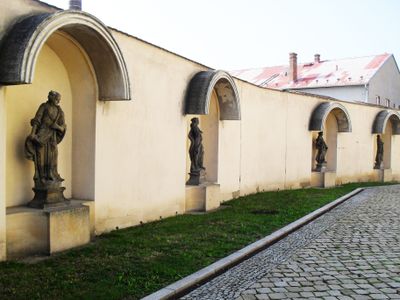 Statues of the Seven Virtues and Saint Francis of Assisi by Karl Waitzmann, statue in Most, Czech Republic