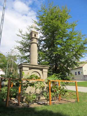 The current structure is a 1994 replica of the original column, placed next to several grapevine plants near the Prosek village square.