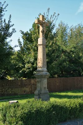 Built in 1905, this wayside cross underwent substantial repairs in 2007 to preserve its structure and cultural monument status in the Czech Republic.