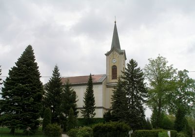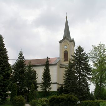 The Church of Saint John the Baptist exhibits a traditional Central European church design with tall windows and decorative stone elements on its facade.