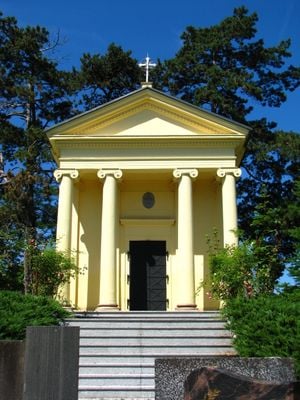 The Sternberg Vault functions as a burial chapel built with traditional stone vaulting techniques, featuring architectural elements from the Empire period of 1827.