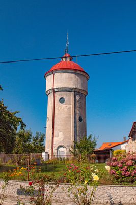 Water tower in Týnec nad Labem, betonový válcový věžový vodojem v Týnci nad Labem za domem Krále Jiřího čp. 224